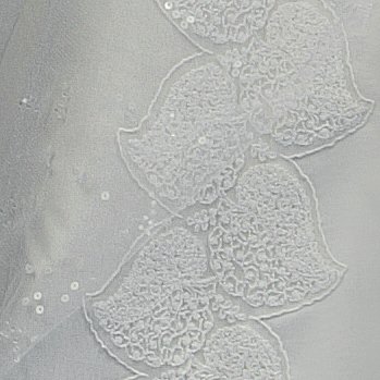 | Silk organza gown with center front embroidered lace bands and satin buttons that run from neckline to hem. | |