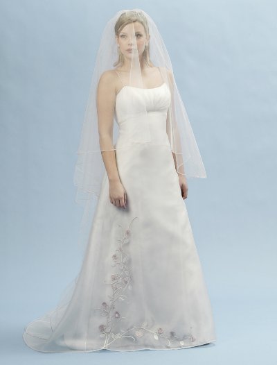 | Silk organza a-line gown with climbing rose embroidered under skirt and center bust line pleating. | |