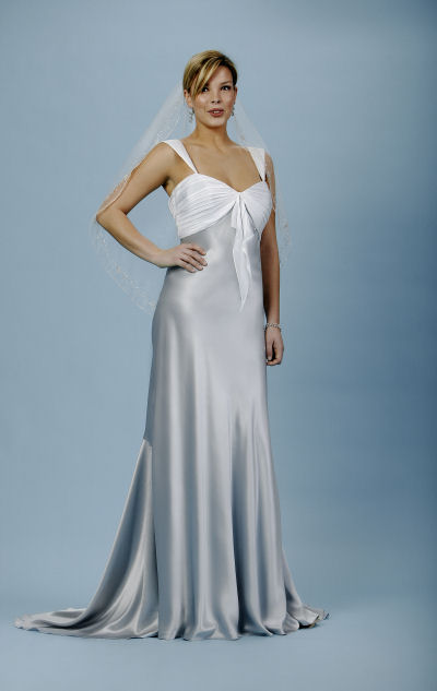 Platinum silk charmeuse bias gown with ruched chiffon bustline and shaped straps has inset circular train. (Also available in white and ivory) Shown with silver vine waist length veil. | |