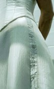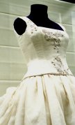 In Birnbaum & Bullock's "Fall 2000" collection they have continued their "SPRING 2000" direction, but with more attention to opulence and detail. Embroidered detachable trains have been added for the classic silhouetted gowns to give that extra drama that certain brides love to exude. For the more understated and sophisticated bride, Birnbaum & Bullock's tuxedo striping stands strong with a more relaxed and modern feel.